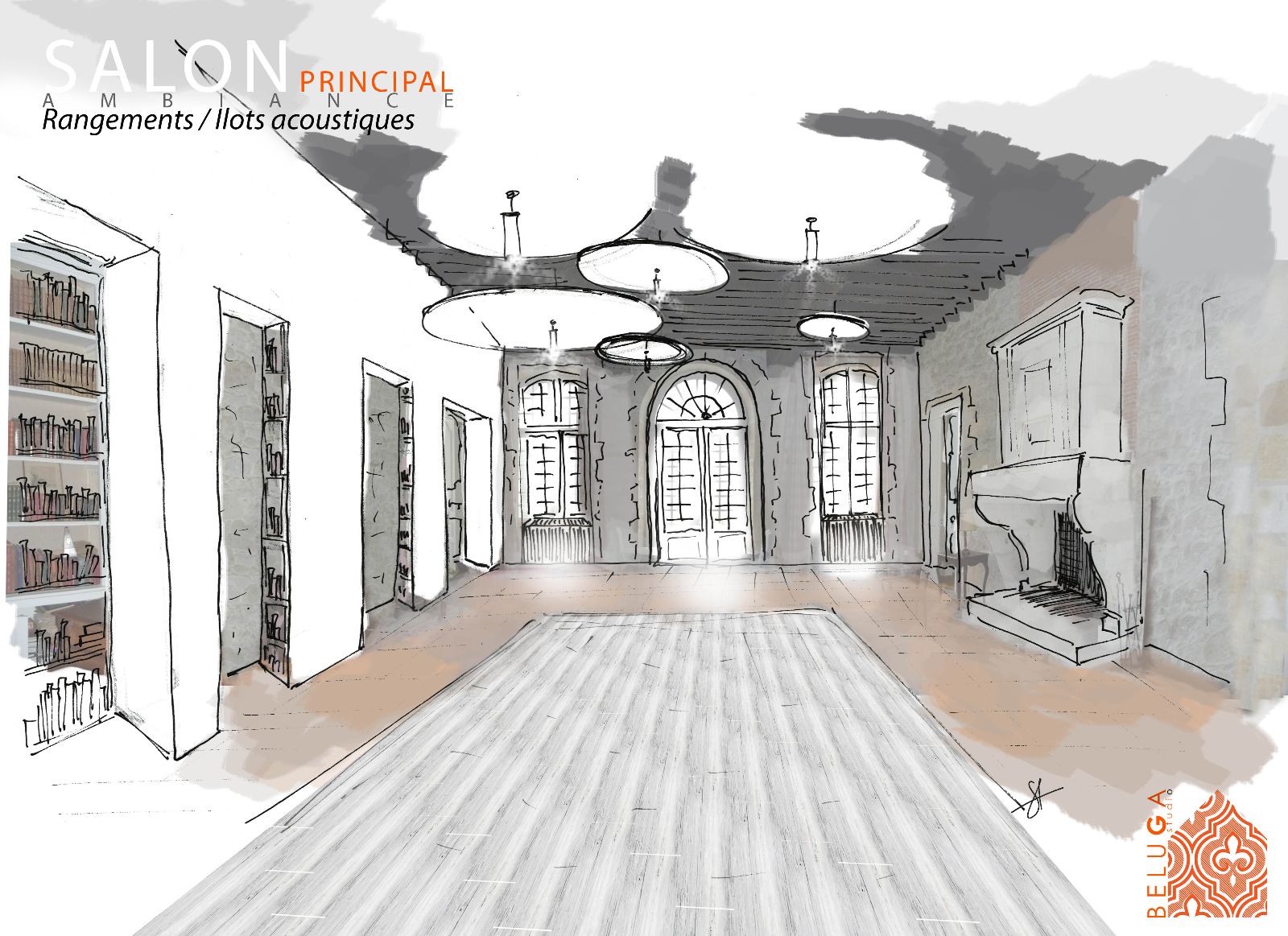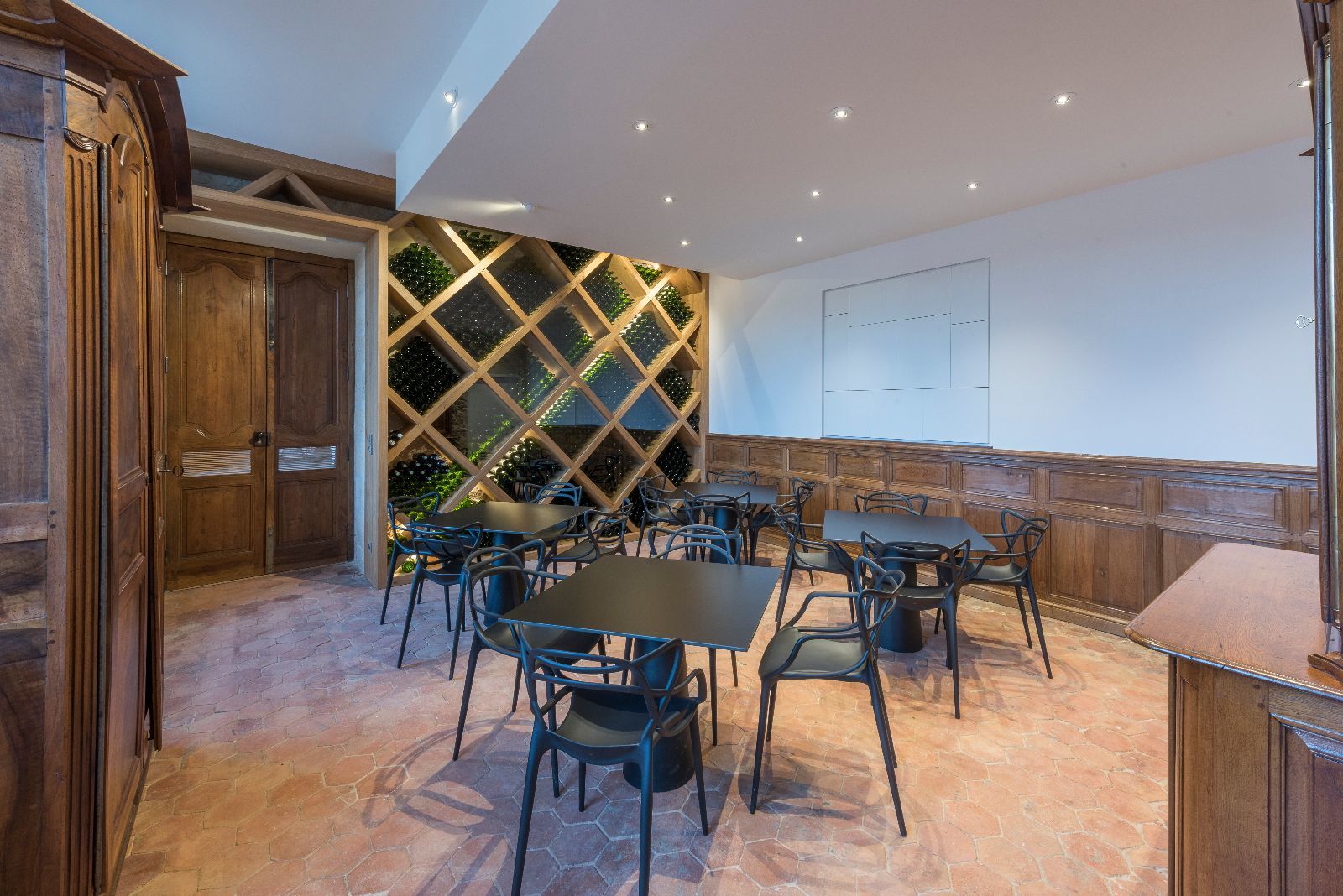 Le premier impact visuel est classique, ancien, mais une seconde lecture plus contemporaine apparait par transparence au travers des vitres, notamment par les éclairages en zigzag visibles en second jour dans le vestibule.