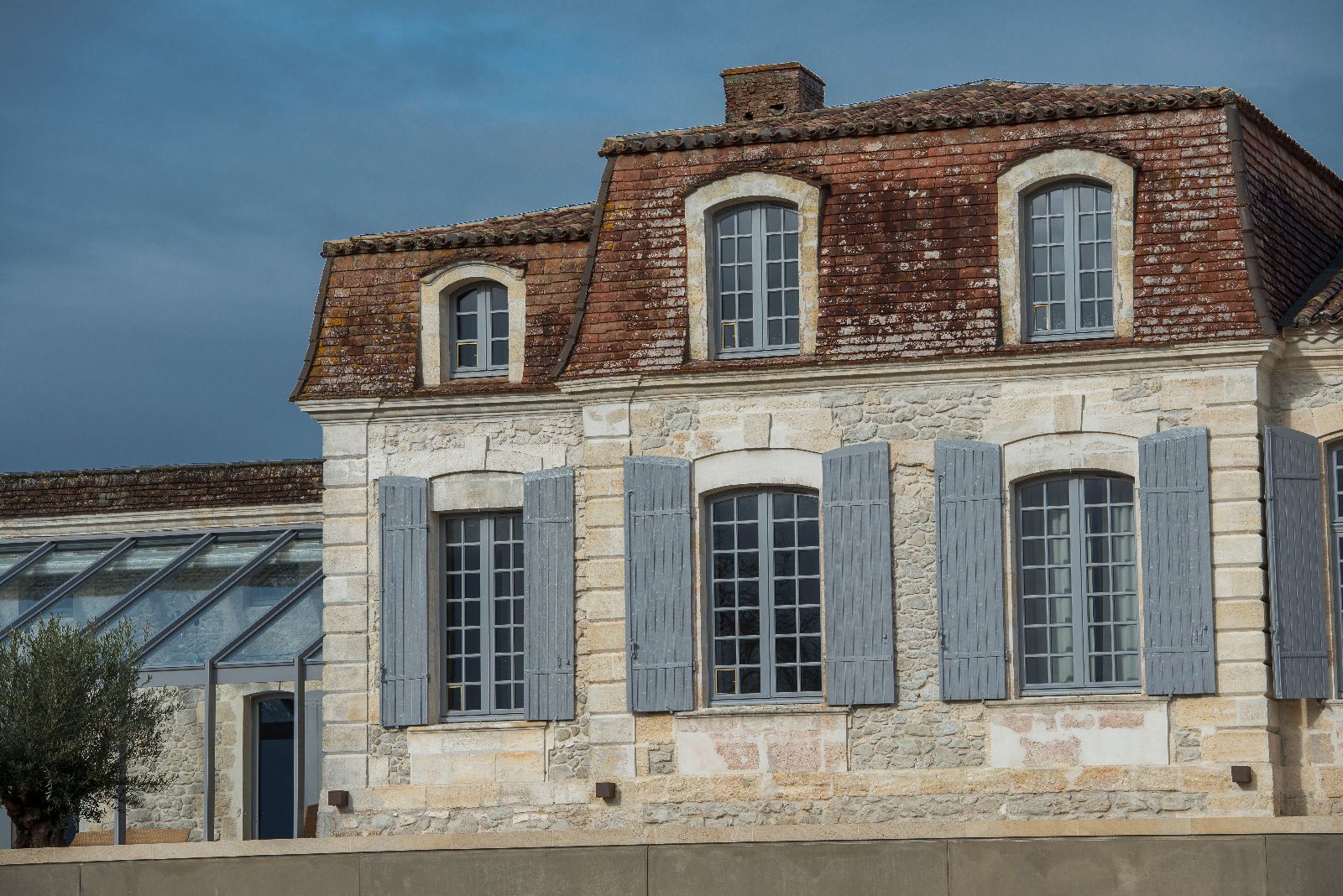 L'idée principale de la rénovation a été de conserver au maximum l'âme de la bâtisse, conserver son aspect ancien, rural et classique. Les éléments contemporains ne sont, dès lors, que très peu visibles de l'extérieur, si ce n'est quelques touches, telle que le béton brut utilisé pour le portail ou le muret de la grande terrasse en façade Sud. Les parties en béton brut sont également recouvertes de pierre taillées de Bordeaux afin de marier ancien et contemporain.